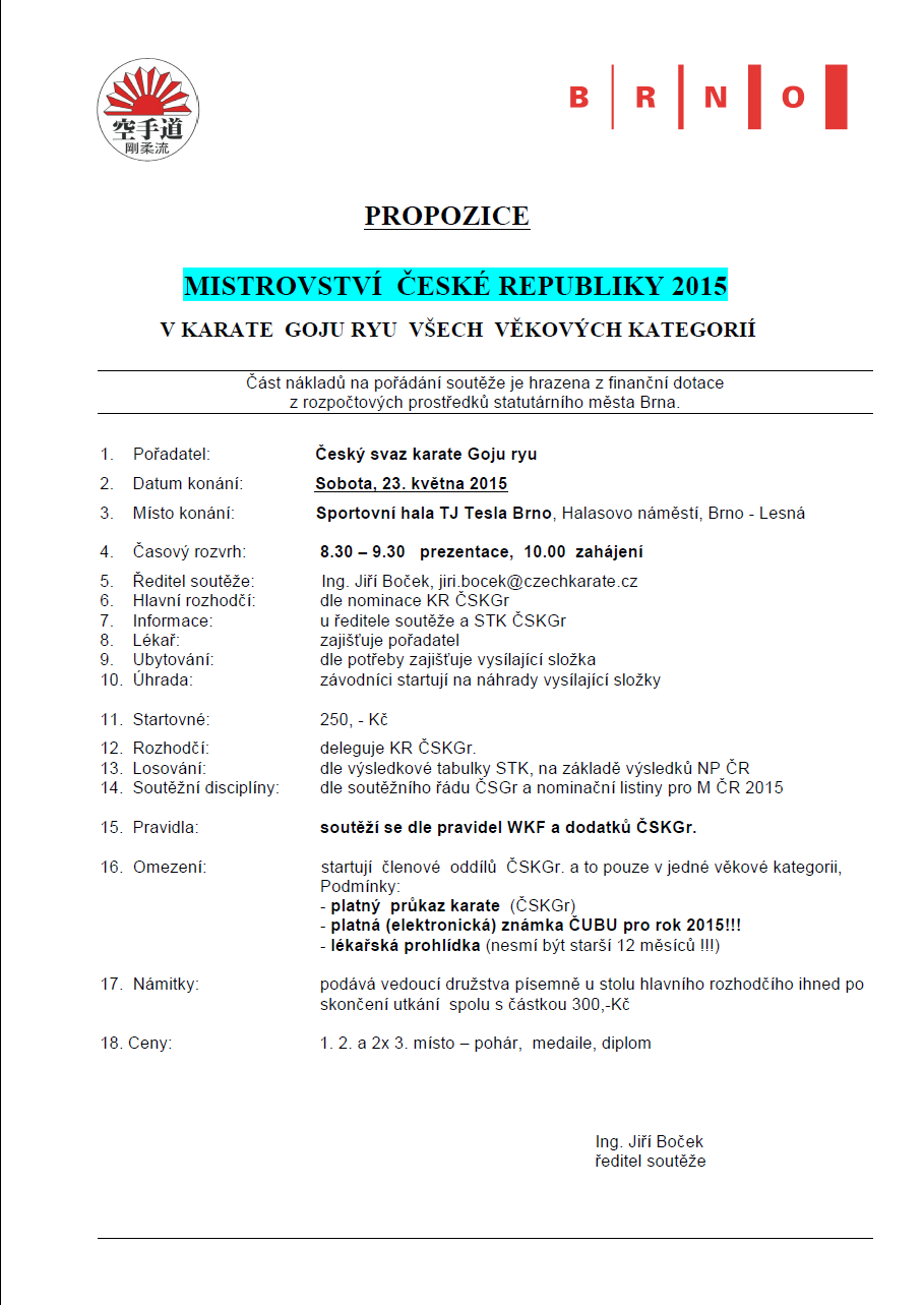 Dne 23. 5. 2015 se bude v Brně konat Místrovství České republiky ČSKGr. Pro propozice čtěte více zde (propozice MČR Goju 2015).