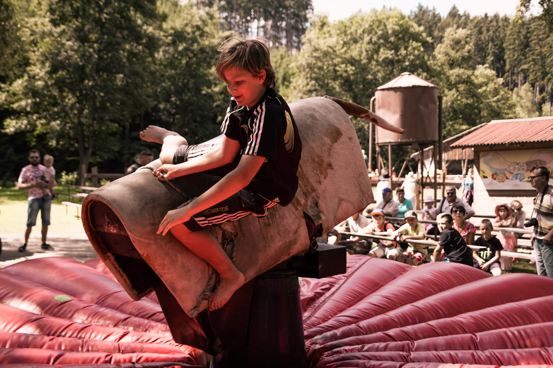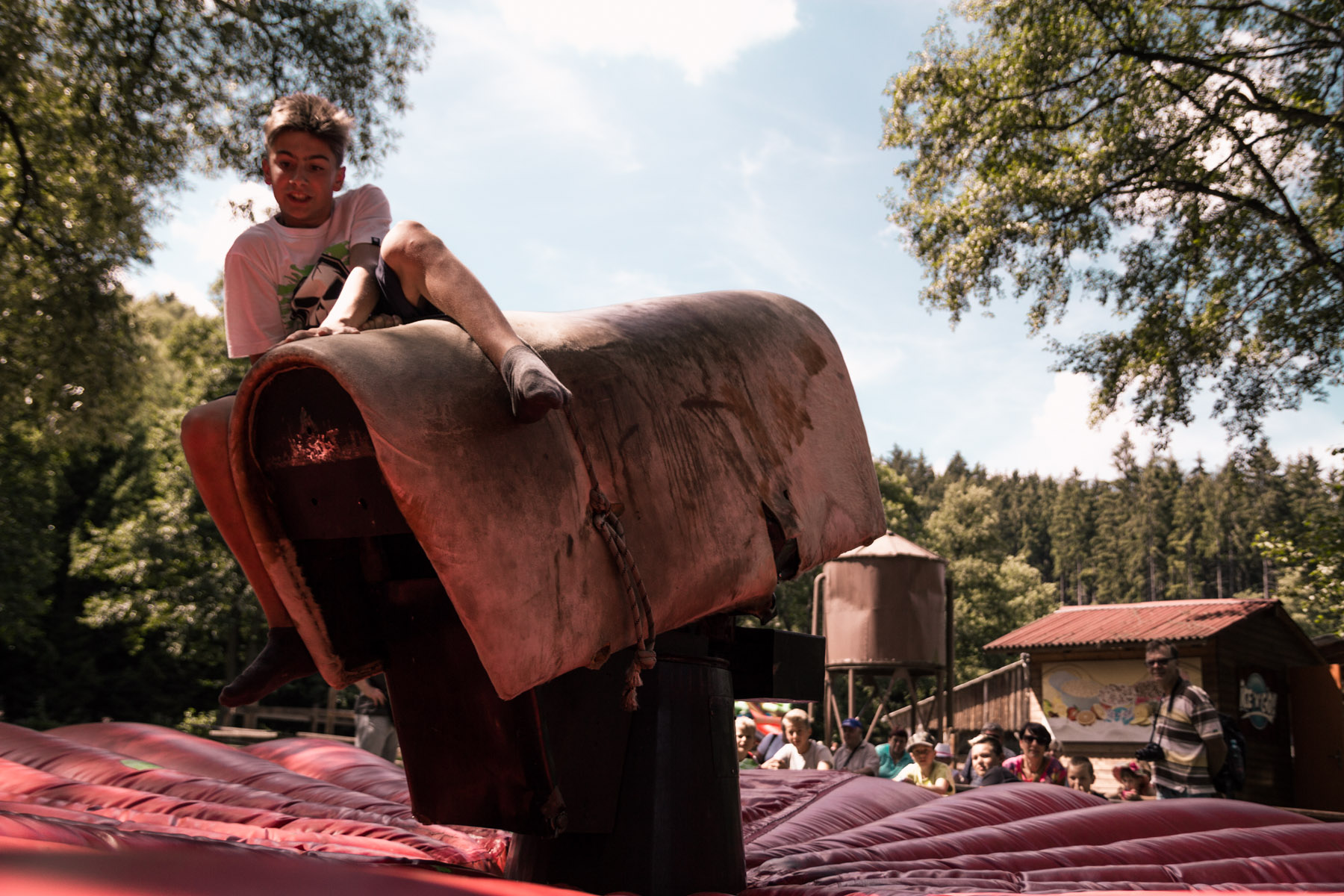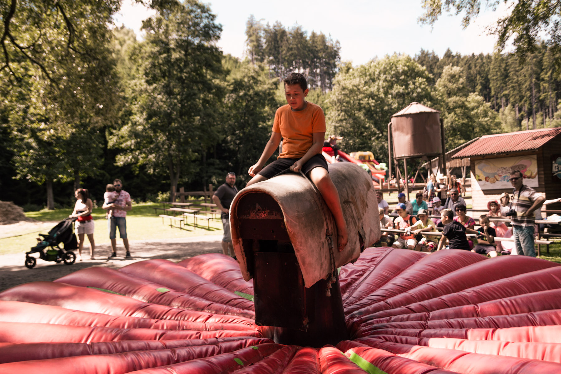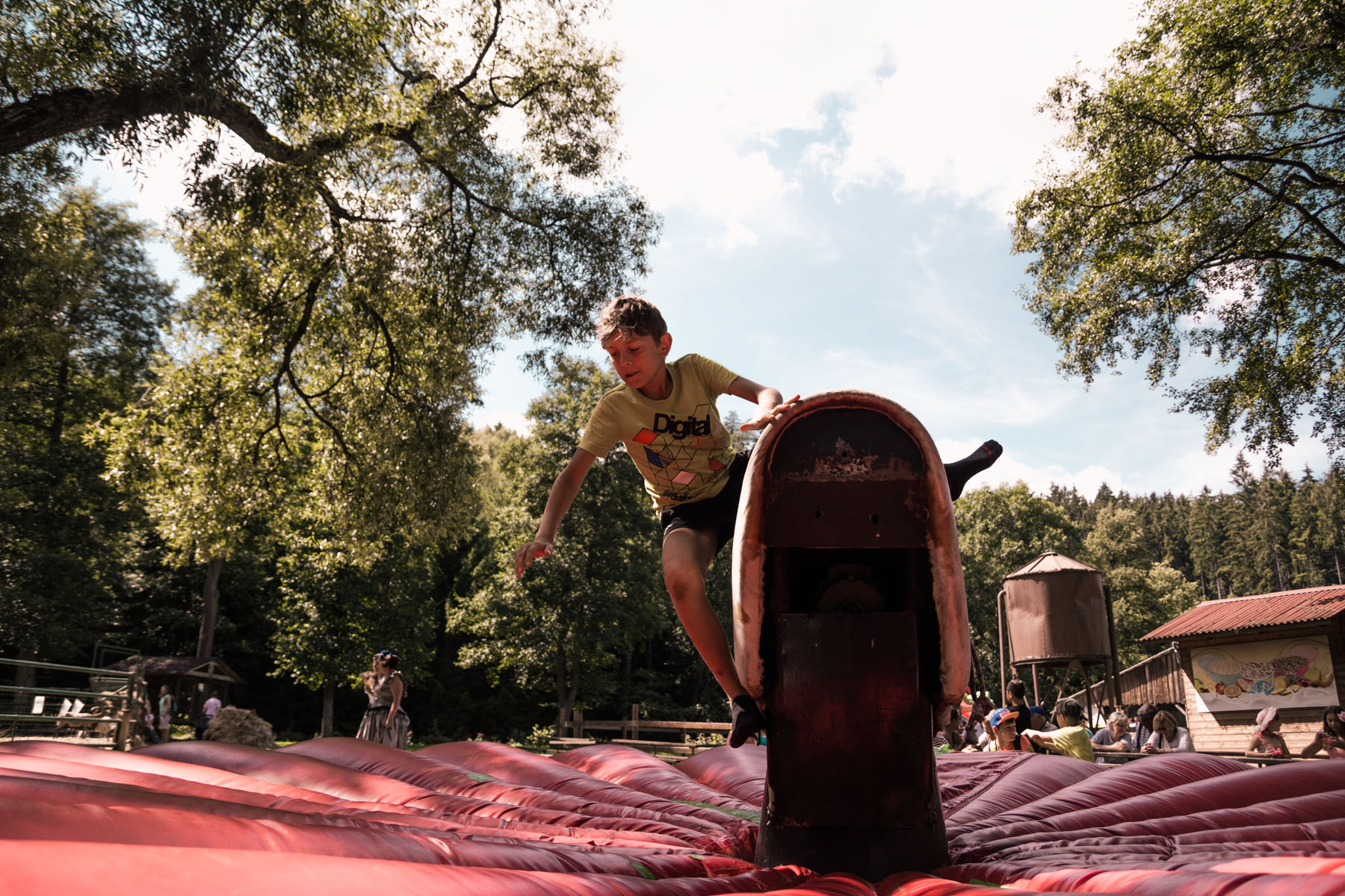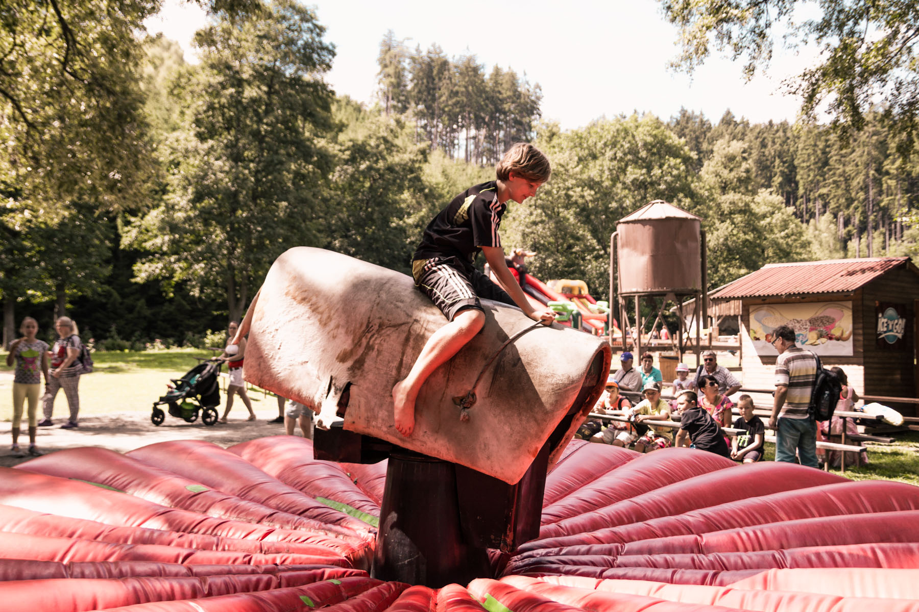 Den třetí letního soustředění: pěší výlet do Šiklova Mlýna a jízda na elektrickém býkovi.
